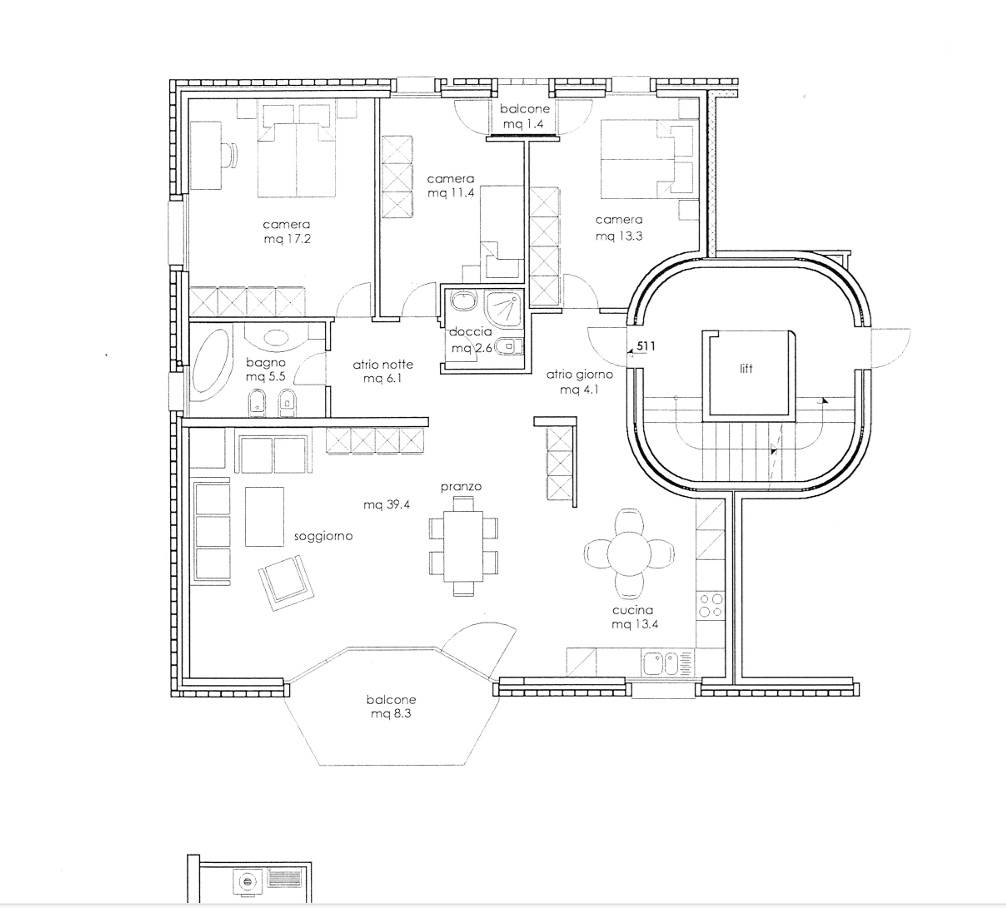 Atrio d'ingresso, spaziosa zona giorno (39.4 mq), grande cucina (13.4 mq), tre camere da letto (17, 13.3 e 11.4 mq), due bagni completi, balcone (8.3 mq) vista scorcio lago.