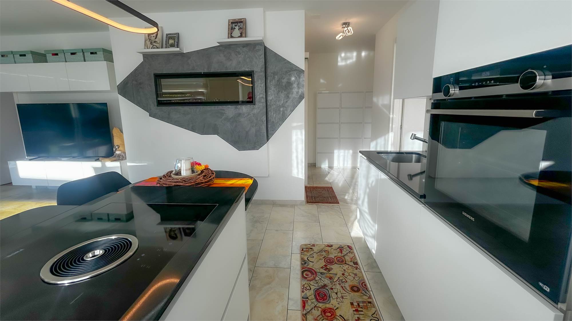 La cucina open space, completamente attrezzata con elettrodomestici di ultima generazione, si integra armoniosamente con il soggiorno che, grazie alle grandi vetrate, gode di un’eccellente luminosità e di un accesso diretto al giardino, dove è presente anche una vasca idromassaggio.