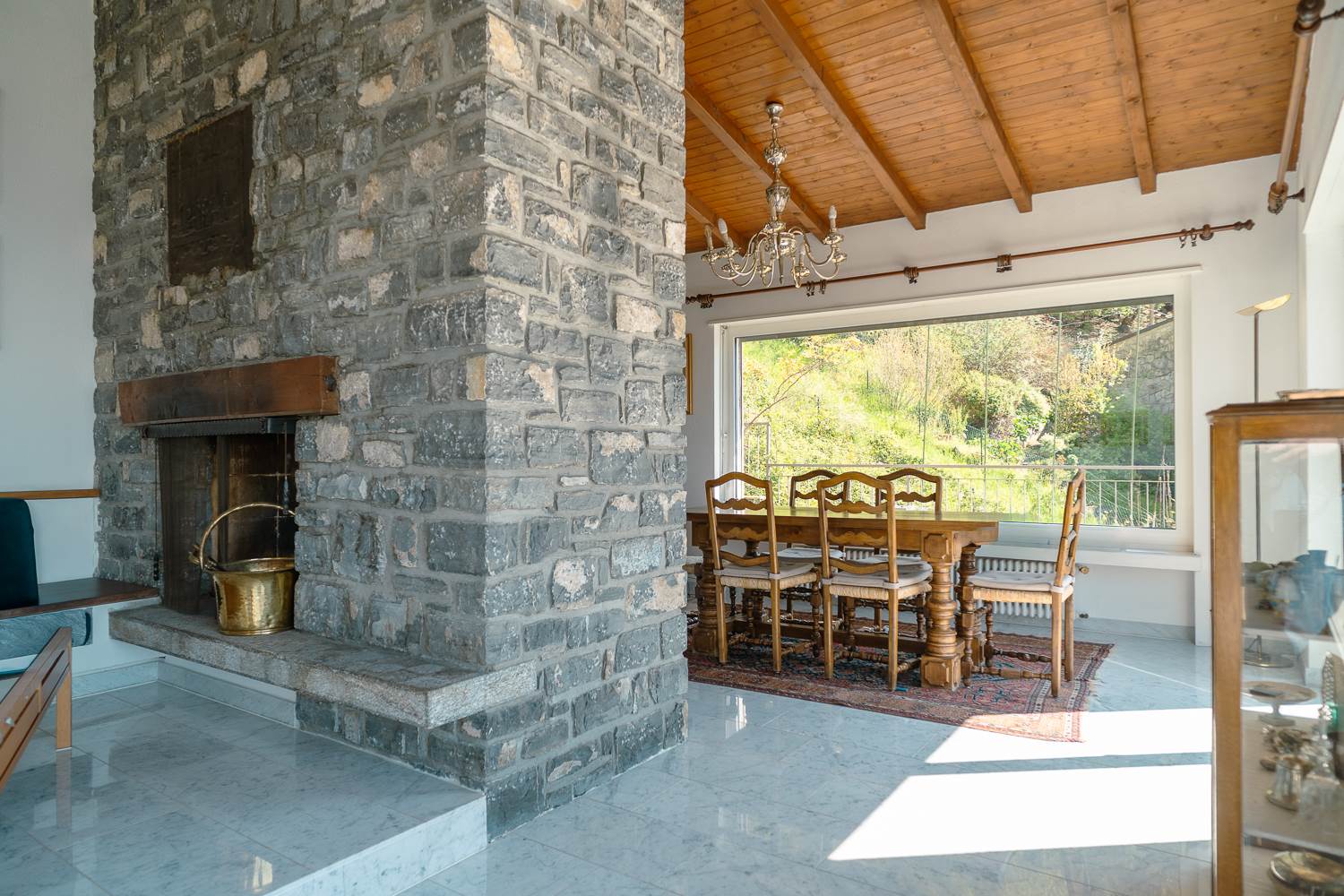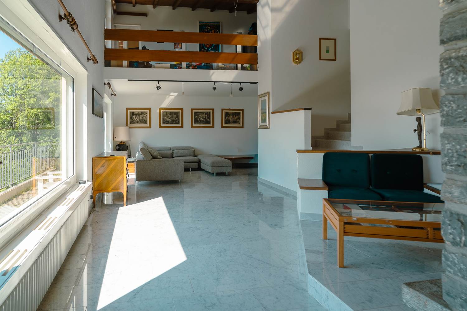 Un salotto con camino, vetrate a tutta altezza e un soppalco che aggiunge atmosfera e prospettiva. La vista? Semplicemente incredibile.